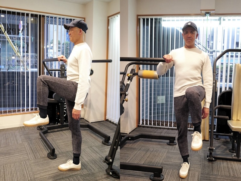 膝を少し内側に向ける(内旋させる)ことを意識しながら、股関節を折りたたむように膝を高く上げ1〜2秒キープします。壁や椅子の背もたれなどにつかまっても構いません。左右それぞれ10回ずつ行います。長時間座りっぱなしになりがちな、デスクワーカーの方にぜひやっていただきたい動きです。