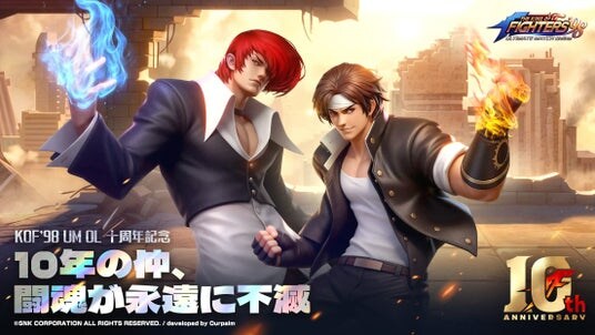 今すぐ『KOF'98 UM OL』にログインして、私たちと一緒に10周年をお祝いしましょう!10年の仲、闘魂が永遠に不滅!