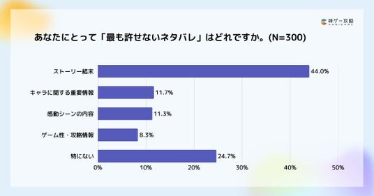「あなたにとって最も許せないネタバレ」を尋ねたところ、「ストーリー結末」が44%と他の項目に比べて最も多い結果となりました。