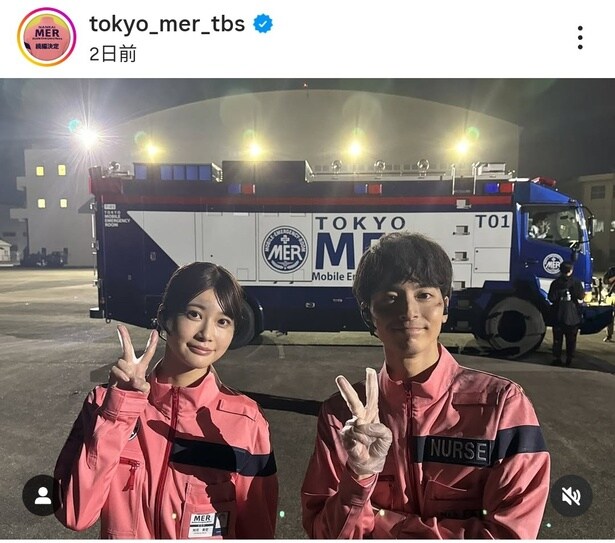 この日、公式Instagramは「南海MER操舵士コンビの常盤くんと知花さん 憧れのTOKYO MERチームとの撮影合間にオフショット」というコメントとともに、「TOKYO MER」のERカー「T01」を背景にした高杉と生見のツーショットを公開した。