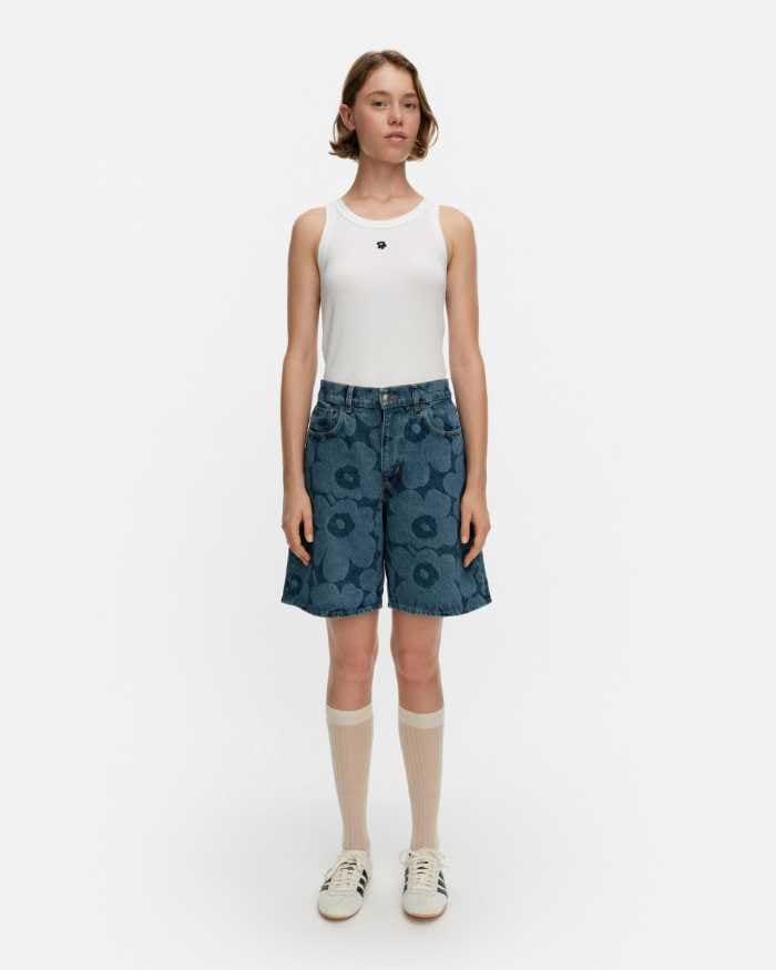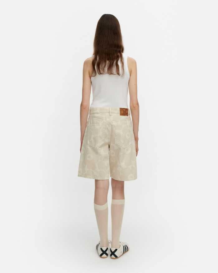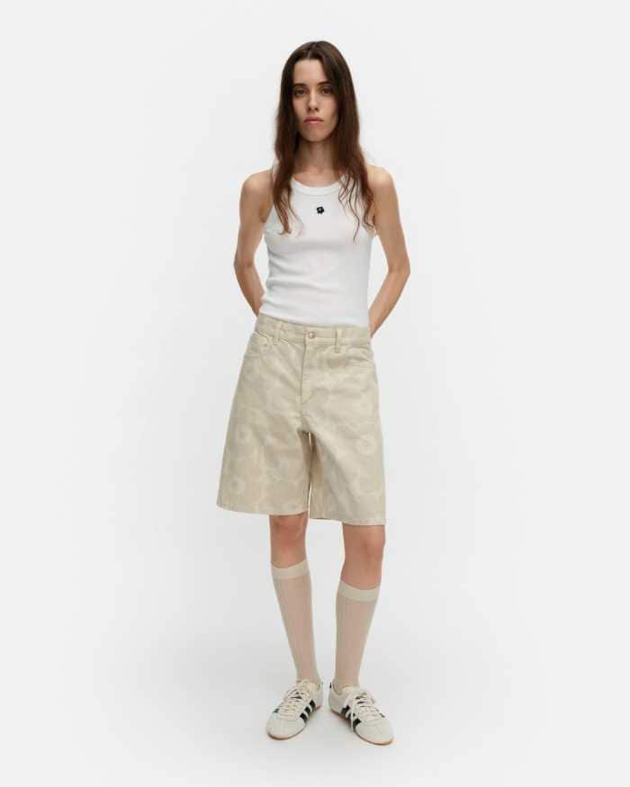 2026年春夏コレクションでは、ブランドを象徴するウニッコ(Unikko)柄をあしらったデニムアイテムが登場。エクリュカラーをベースに、洗練された印象を演出します。