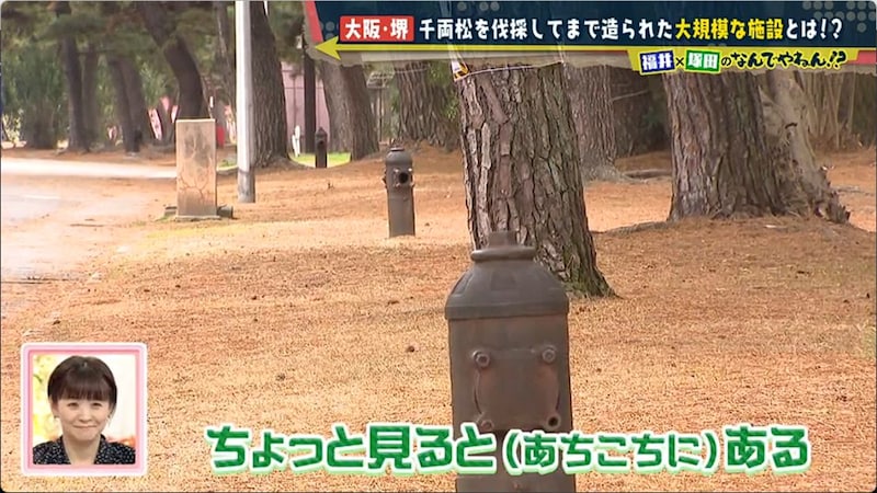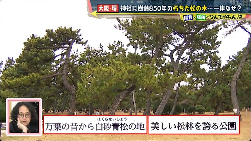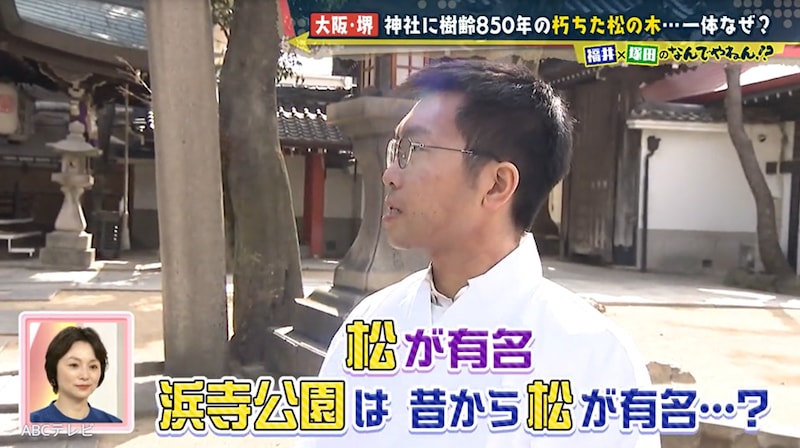 菅原神社の関係者いわく千両松は、神社から約5km先の浜寺公園にあったもの。同公園は昔から、「松が有名なところ」だったそうだ。そこで塚田と福井アナは、調査のために浜寺公園へ向かった。