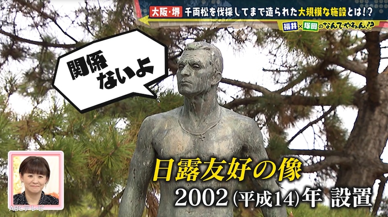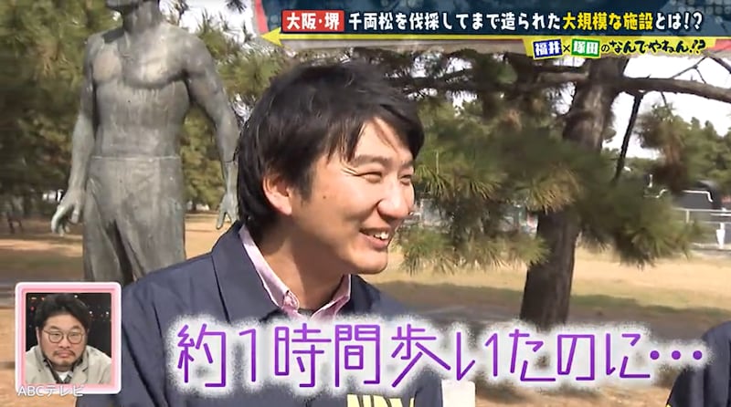 そこで塚田と福井アナは、広大な浜寺公園を大調査! 明治維新後の日露戦争に着目して、約1時間かけて“日露友好の像”のもとへ向かうも、謎と関係なさそうで撃沈してしまった。その後も2人は、昼食を抜いてまで“丸みがあって中は筒抜け”なものを必死に探すが、“これだ!”というものを見つけられず迷走した。