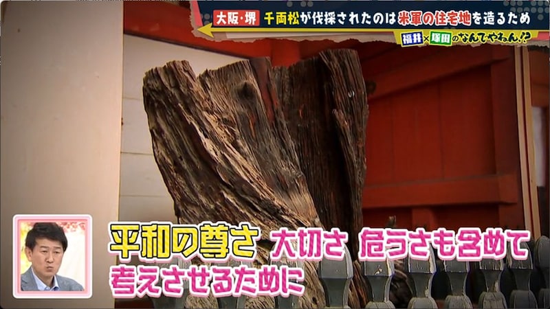 いくら歴史があって大切なものも、戦争になればあっけなく消えてしまう。平和の尊さや戦争の危うさなどを考えさせるために、伐採された千両松を菅原神社では今も大切に保管しているのだった。