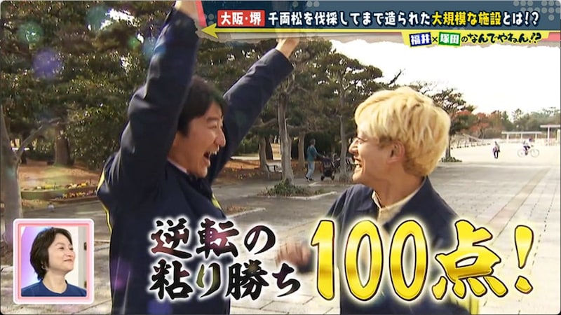 浜寺公園は、明治6年に開園した公園。広大な園内には、明治維新の元勲・大久保利通がこの地の松林伐採を惜しんで詠んだ和歌の石碑がある。この石碑から塚田と福井アナは、「千両松は明治維新の近代化により、惜しくも伐採されてしまったもの」と推理。しかし歴史探訪プランナーの森なおみさんに、「千両松と明治維新は関係ありません!」と否定されてしまった。