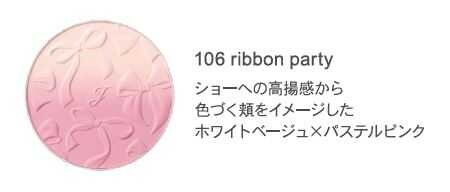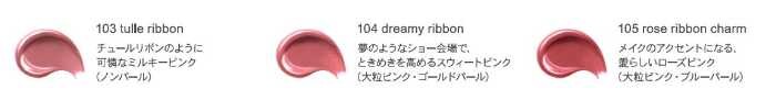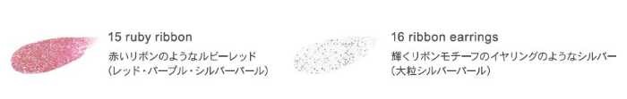 アイカラーパレット(7色)、ピンキッシュローズのリキッドアイライナー、ホワイトクリアのハイライター、ピンクベージュのリップ、さらにリボンをモチーフにしたクラッチ風ポーチがセット。