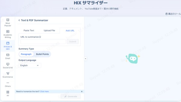 ・高度な編集や細かいカスタマイズ機能は一部制限されている3. HIX Summarizer