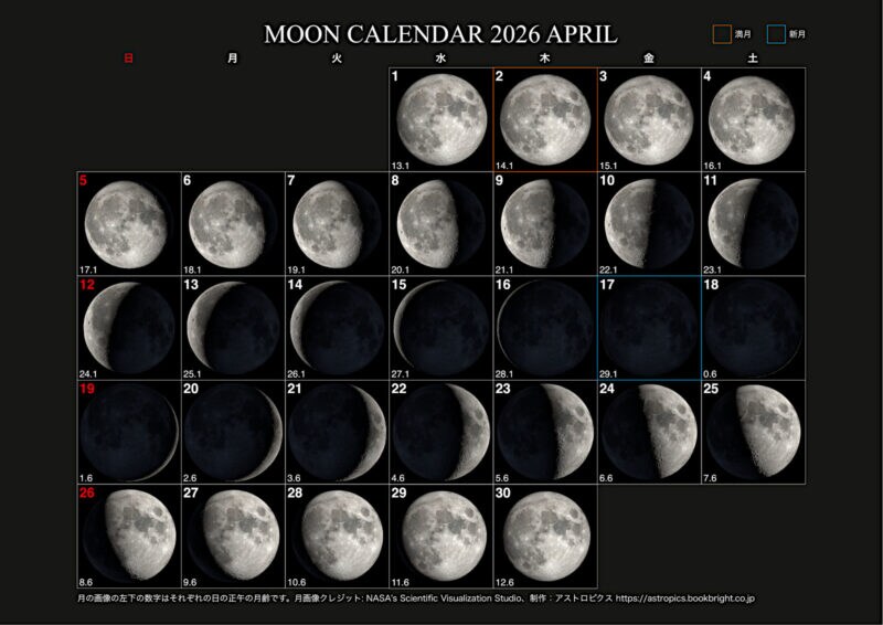 アストロピクスでは昨年末、2026年の1年間の月の満ち欠け(月齢)のカレンダーを掲載しました。今回紹介するのは、編集部で作成した2026年4月の月の満ち欠けカレンダーです。