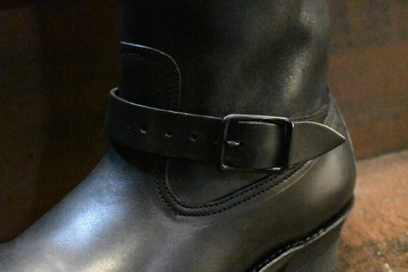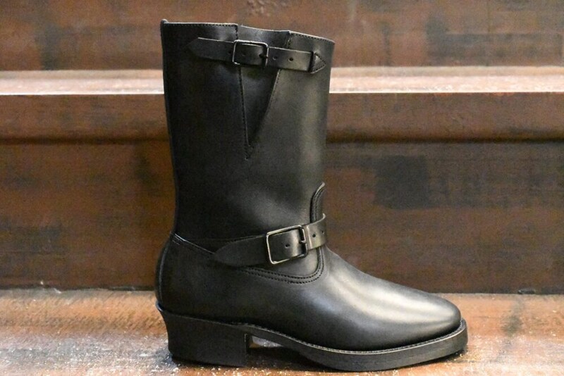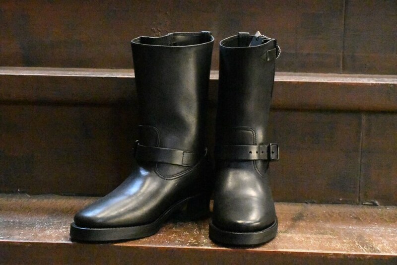伝説的なヒットとなったビルトバックのエンジニアブーツ。603は最高級馬革のグイディ社製ホースバットを使用した1足。ドレスライクな佇まいに、柔らかいレザーの質感と甲高の方にも足入れしやすいフィット感。バックルまで黒なオールブラック仕様。無骨な印象の強いエンジニアブーツだが、美しいフォルムに色気のあるレザーの質感を是非体感して頂きたい。