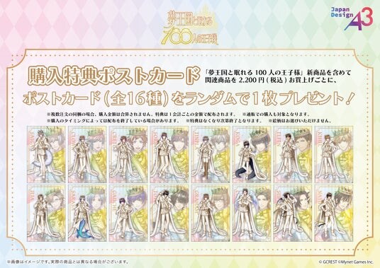 『夢王国と眠れる100人の王子様』新商品を含めて関連商品を1会計2,200円(税込)お買い上げごとに、購入特典としてポストカード(全16種)をランダムで1枚プレゼント!