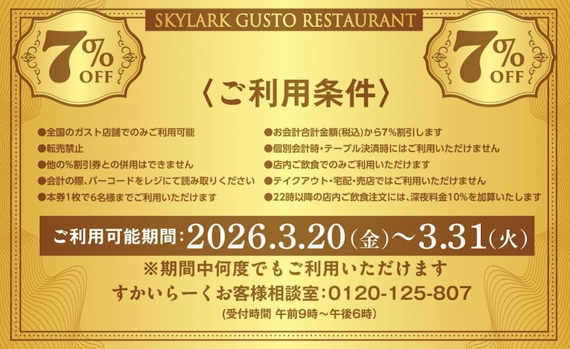 全国のガスト店舗で、期間中何度でも利用できます。店内飲食限定です。会計の際に、ガストの公式Xが投稿した画像のバーコードをレジで読み取ってください。