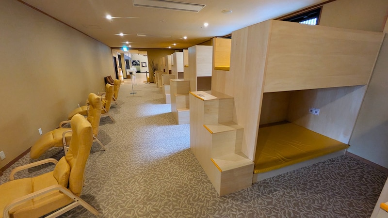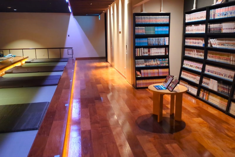 秘密基地のような二段式おこもりスペースやマッサージチェア、漫画約3000冊の無料休憩室までありました。