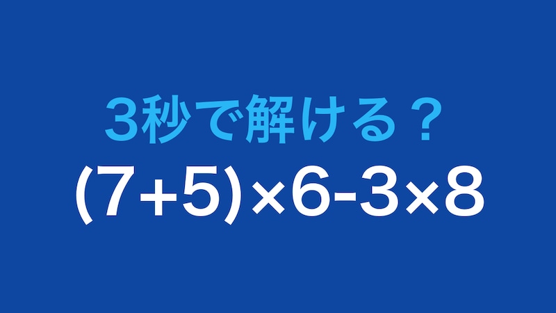 まず括弧の中を計算すると、7+5=12 になります。次に掛け算を優先して処理します。12×6=72、3×8=24 です。最後に引き算を行い、72-24=48 となります。括弧と掛け算の優先順位を守ることがポイントでした。