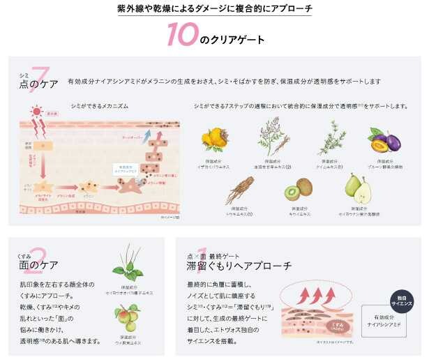 10のクリアゲート※6という多角的なケア設計により、点ではなく面で肌悩みに働きかけ、透明感※8あふれる肌へ導きます。