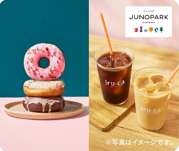 「JUNOPARK by SEKISUI HOUSE」内の「iru-ca donuts & coffee」からは、看板メニューのドーナツがラインナップ。しっとり軽やかな生地と、甘さを抑えたやさしい味わいが特徴で、コクがあり後味がきれいなコーヒーとともに、一息つく時間を提供してくれます。