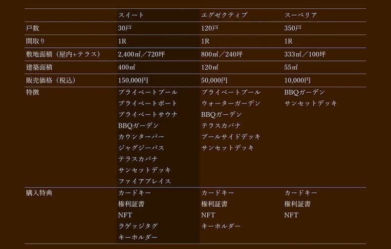 グレードはスーペリア(1万円・350戸)、エグゼクティブ(5万円・120戸)、スイート(15万円・30戸)の3種類。最上位のスイートはプライベートプールやプライベートサウナ、カウンターバーなどを備え、敷地面積は2,400㎡(720坪)と圧巻のスケールを誇る。いずれもバーチャル空間上の仕様であり、実在する土地建物ではない。