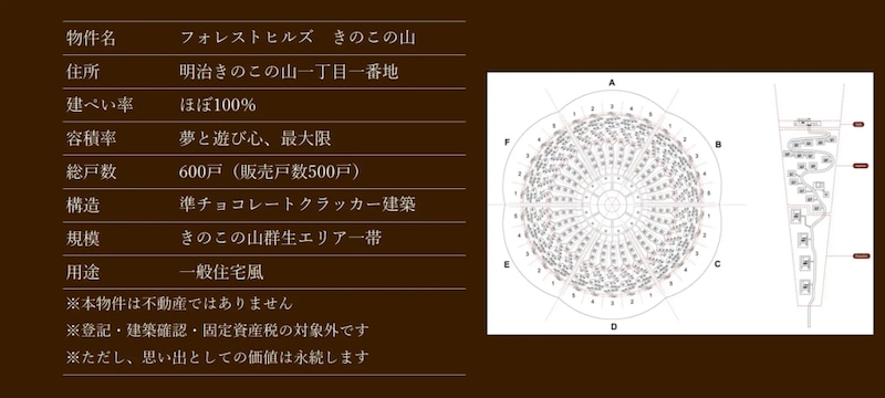物件名は「フォレストヒルズ きのこの山」、住所は”明治きのこの山一丁目一番地”、構造は「準チョコレートクラッカー建築」。登記・固定資産税の対象外である一方、「思い出としての価値は永続する」と物件概要には記されており、遊び心あふれる設定が隅々まで貫かれている。
