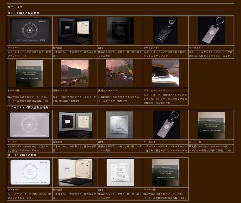 購入者には区画番号を明記した権利証書(NFT付き)とカードキーが届く。カードキーをスマートフォンにかざすことでバーチャル空間に入場でき、「きのこの山」の世界を散策したり、プールやサウナで過ごしたりすることが可能。自分の家に友人を招待して交流することもでき、スイートグレードは部屋のカスタマイズにも対応している。