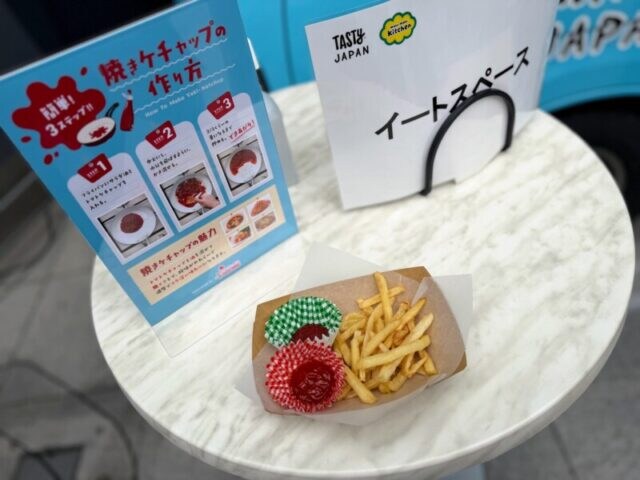 会場で実際に「焼きケチャップ」を実際に味わうことができました。通常のトマトケチャップと、「焼きケチャップ」をフライドポテトにディップして食べ比べ。