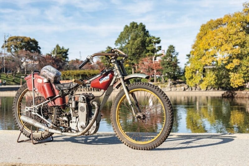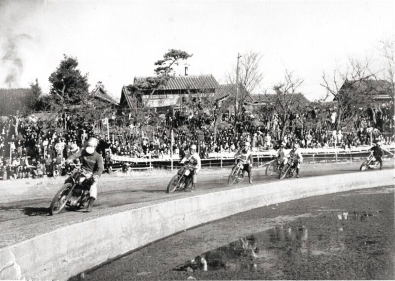 上の写真は1955年の天王川公園オートレースの一葉。下の極東レーサーは当時、このコースを走っていたレースバイクで、その姿を残したまま会場に並んだ。次なる目標はこの場所を再び走ることだ。