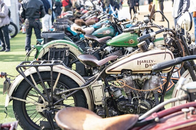 国内外のさまざまなメーカーの車両が並んだ。H-Dは初期OHVやフラットヘッド、オホッツバルブなど、歴史的車両が勢ぞろい。