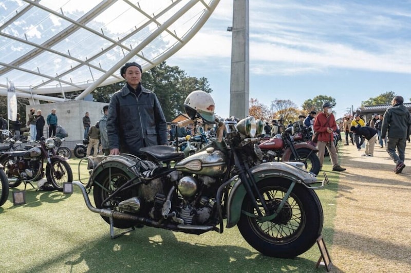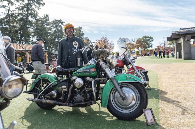 ファーストイヤーの「ナックルヘッド」に乗る大場さん。36年モデルには前期/中期/後期で仕様変更があるが、これは「フロッグアイ」と呼ばれるロッカーボルトを備えた前期モデル。いわずもがな絶滅危惧種。