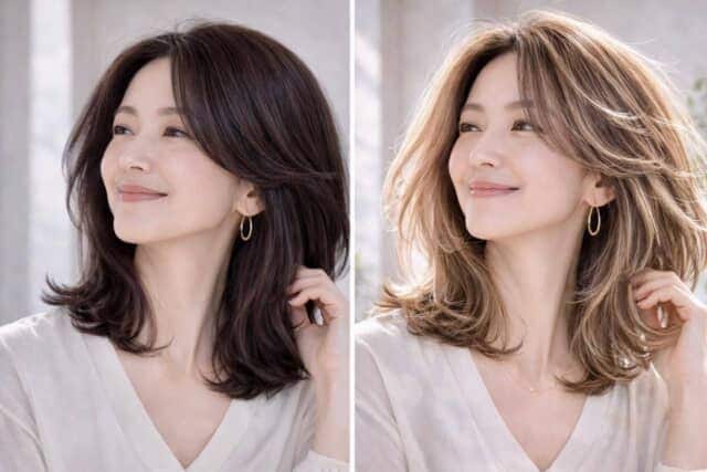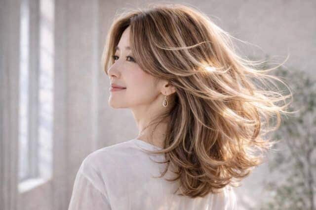 例えば、細かいハイライトを入れることで、白髪との境目が自然にぼやけ、伸びても目立ちにくくなります。さらに、色に濃淡が生まれることで、髪全体に立体感と動きが出るのも特徴。結果的に、軽やかな印象につながります。