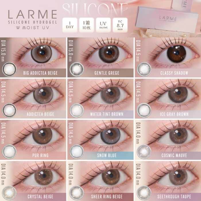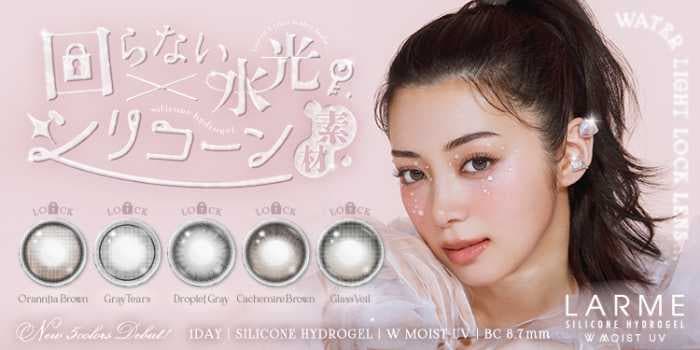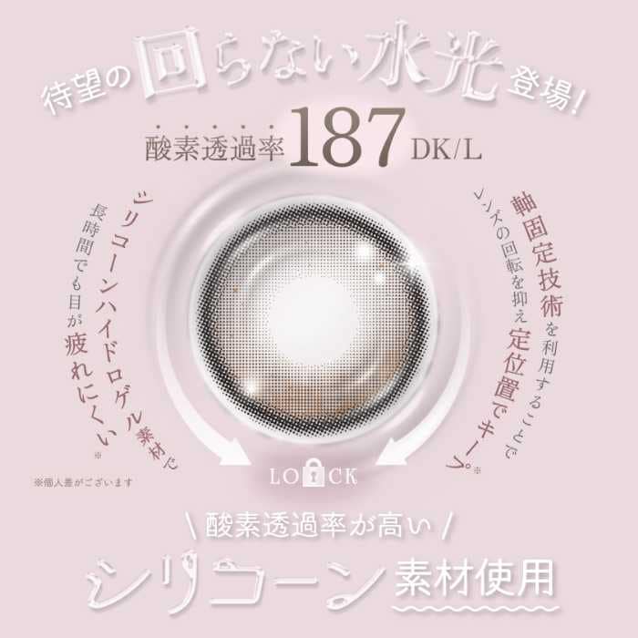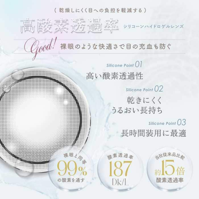 さらに、シリコーンハイドロゲル素材を採用することで、長時間の装用でも乾きにくく快適なつけ心地に。見た目の可愛さだけでなく、機能面にもこだわったアイテムです。