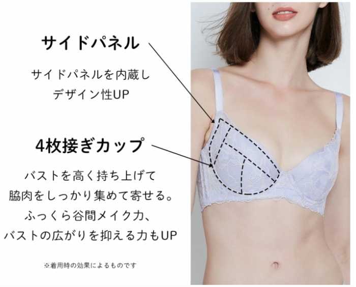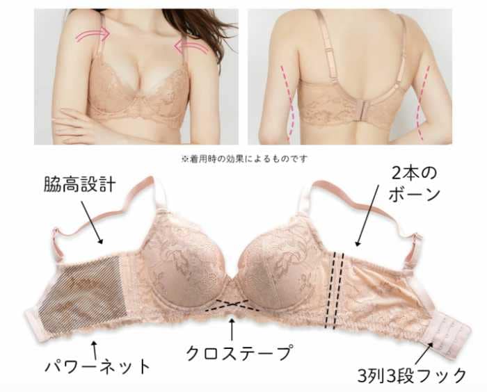独自の脇高設計とパワーネット、さらに2本のボーンでお肉を逃さず固定。HEAVEN Japanオリジナルの4枚構造カップが立体感のある美しいバストを演出します。