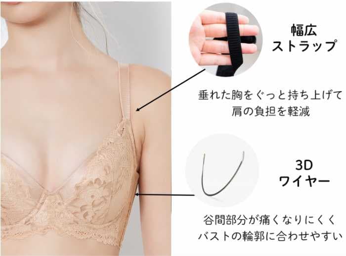加えて3Dワイヤーが優しくフィットし、幅広ストラップで肩への負担も軽減。補整力と快適な着け心地を両立した設計で、日常使いにもぴったりです。