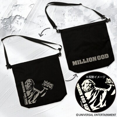 斜め掛けでも手持ちでも使える便利なバッグにゼウスと「MILLION GOD」の文字をド派手にプリント。