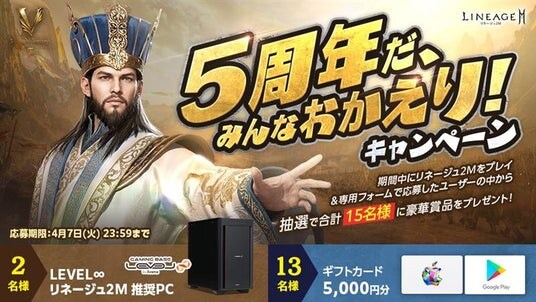 期間中に、「リネージュ2M」公式Xをフォローし、対象のキャンペーンポストを引用リポストし、ハッシュタグ「 #リネツー 」「 #私の5年5文字 」をつけて5年間の想いを5文字で投稿いただいた方の中から抽選で、5名様にApple Gift CardまたはGoogle Playギフトカード5,000円分が当たるキャンペーンを実施します。