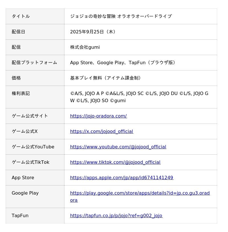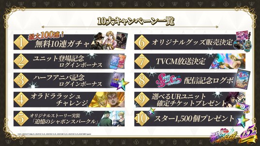 株式会社gumi(本社:東京都新宿区、代表取締役社長:川本 寛之/以下、gumi)は、好評配信中のアプリゲーム『ジョジョの奇妙な冒険 オラオラオーバードライブ』(以下、オラドラ)において、リリースから半年を記念した「0.5th Anniversaryキャンペーン」を3月25日(水)から開催することをお知らせいたします。