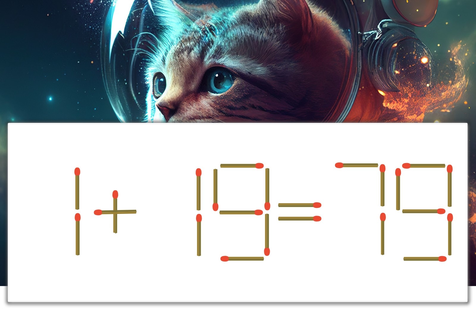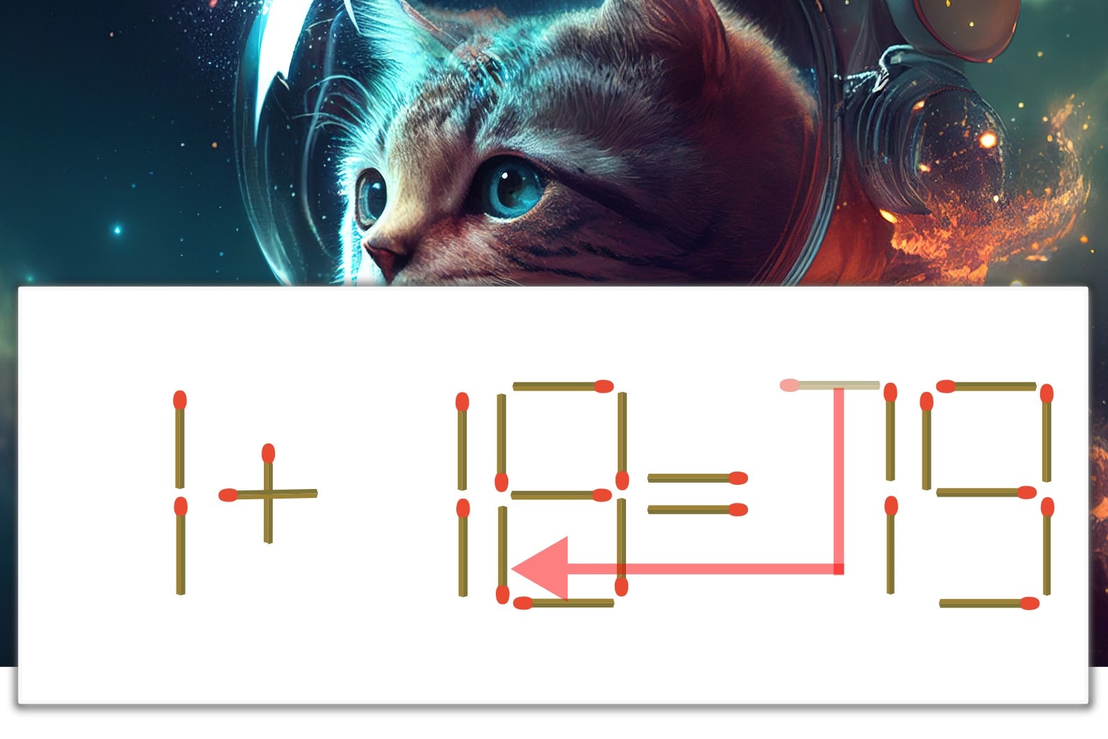 「7」を別の数字に変化させると答えが導き出せます。「7」のマッチ棒を1本移動して、「9」を「8」にしてみましょう。すると、「1+18=19」が成立します。