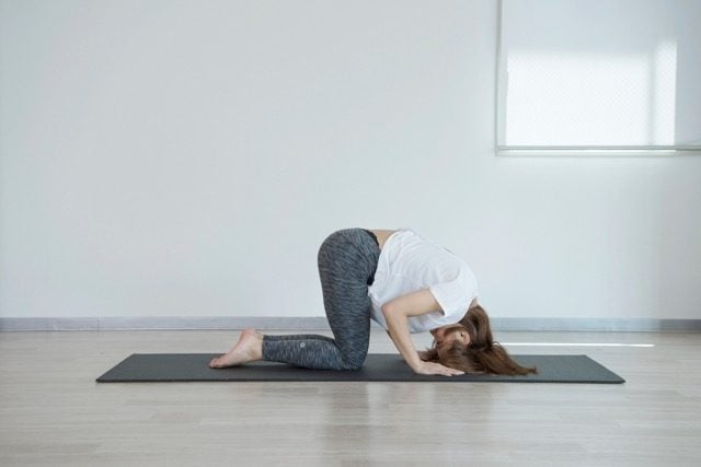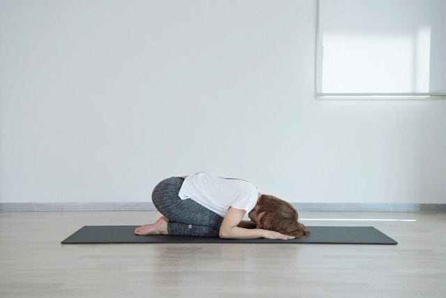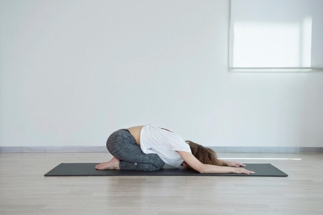 (6)キープが終わったらゆっくり体を戻して「チャイルドポーズ」で体を休める