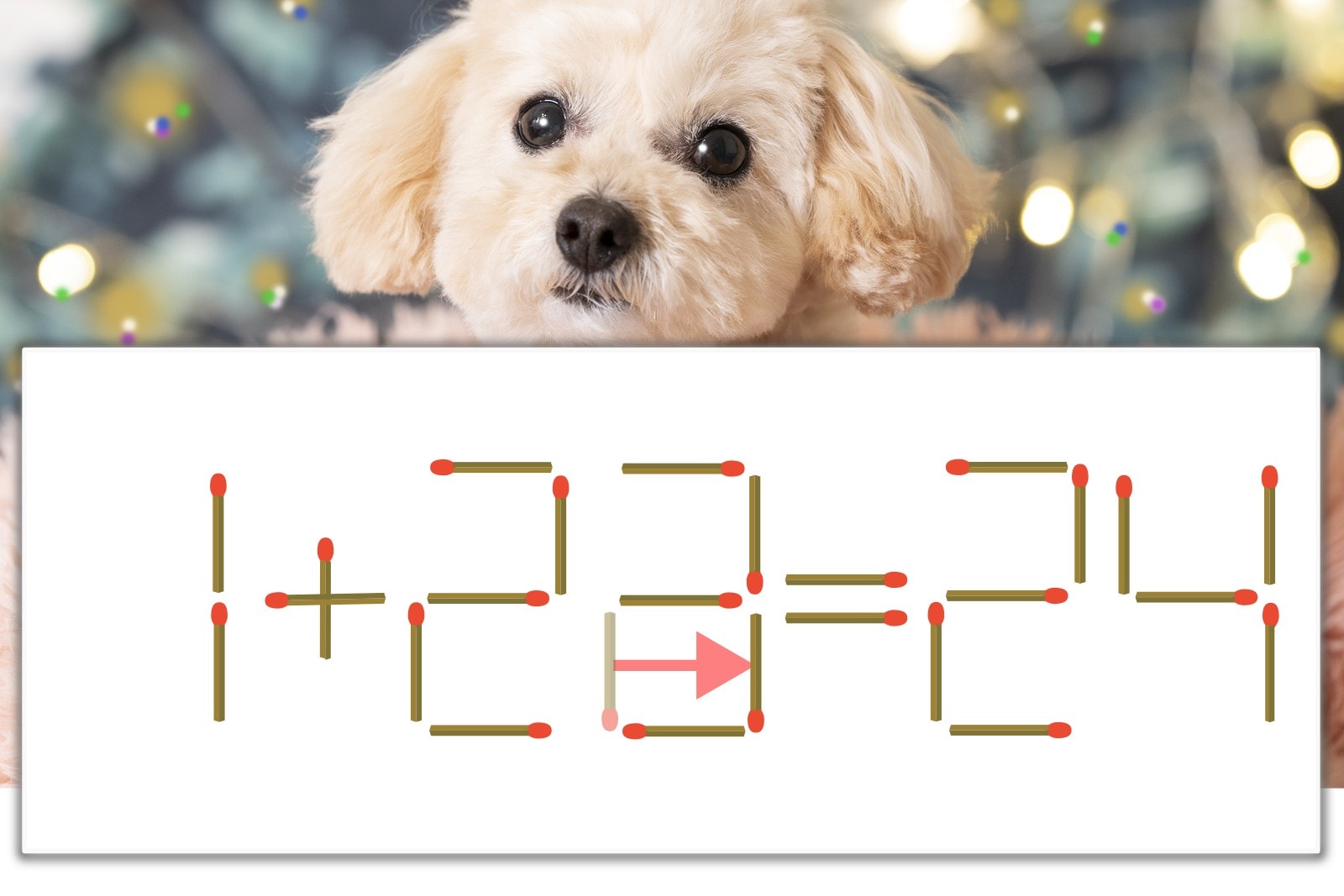 「2」を別の数字に変化させると答えが導き出せます。「2」のマッチ棒を1本移動して、「2」を「3」にしてみましょう。すると、「1+23=24」が成立します。