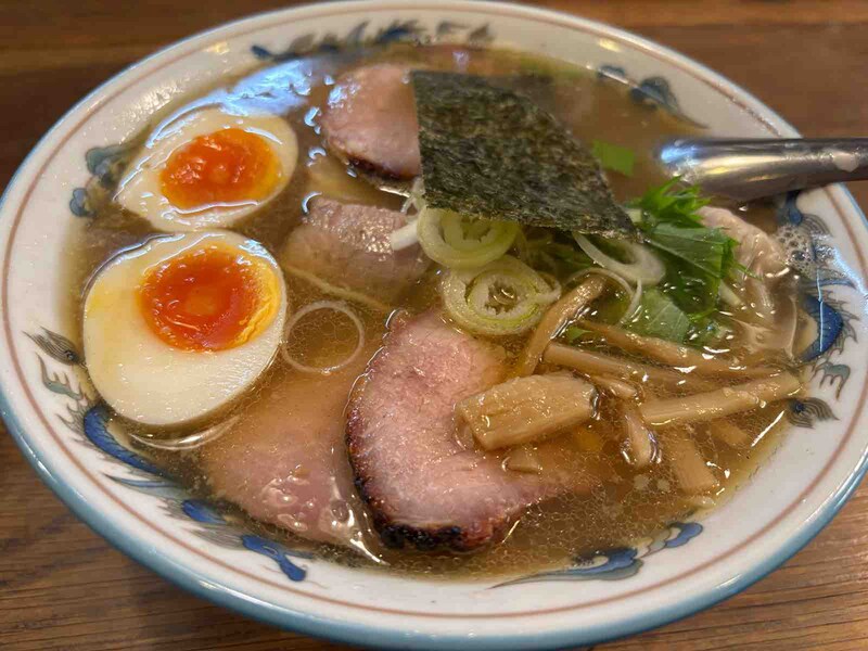 「醤油らーめん」を注文。具はチャーシュー2枚、メンマ、青菜、ノリ。麺は太め縮れの自家製麺。