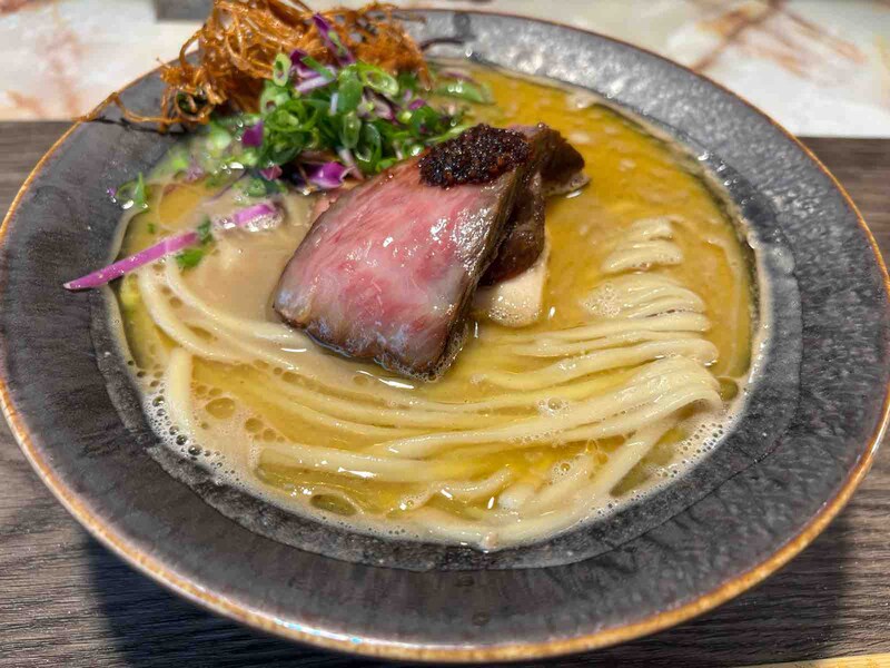 超熟豚骨と上州牛サーロインの融合スープ。5種類のスープを炊いて、豚骨でマスキングしてバランスをとる。濃密ながら旨味がナチュラルで、上州牛の油とポルチーニ油と香味油もダブルで、美味しさの層を作っている。チャーシュー類もご馳走で、麺量もしっかりで食べ応えがあり、大満足。