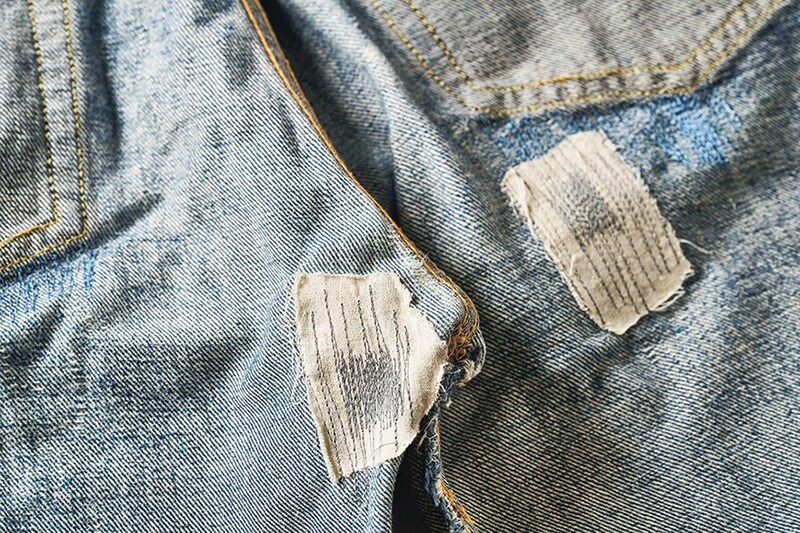 膝以外にも穴が空いていた部分を修繕してくれた。これは裏部分。布を水性ボンドで貼ってから生地と同じ色を選んでミシンで縫う。