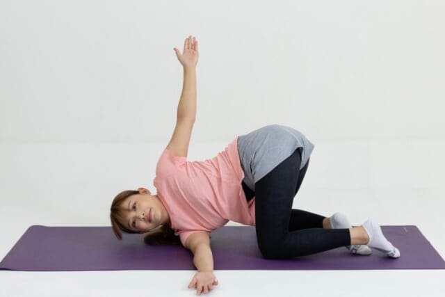 左腕を後方へ広げ、胸を開く方向にねじって呼吸を止めず30秒キープ。背中の奥が動く感覚を意識しましょう。反対側も同様に行います。