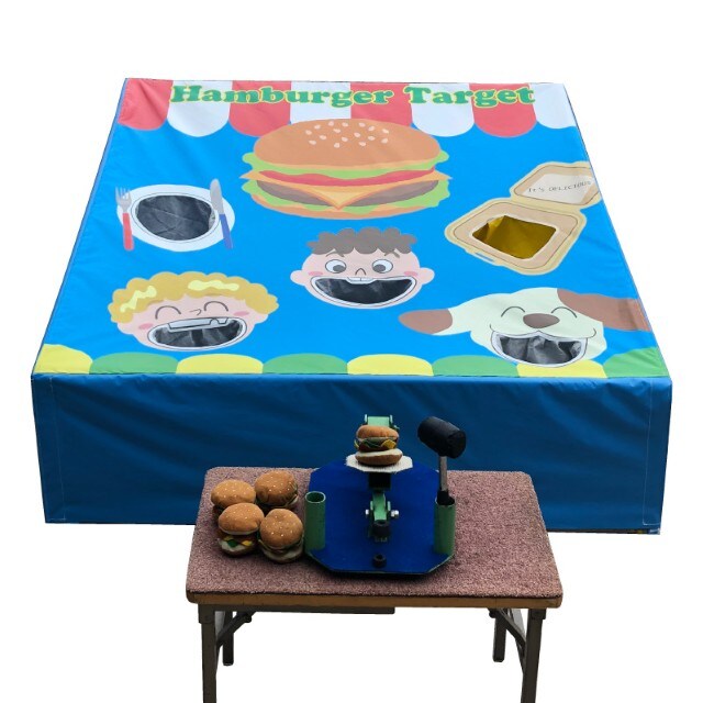バーガーターゲット/叩き台にハンバーガーをのせて、ハンマーで思いっきり叩きハンバーガーを飛ばします。ハンバーガーを上手く食べさせられたら成功です。