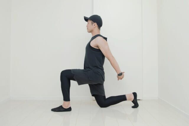 (1)片方の脚のひざを床につき、もう片方の脚のひざを立てて、両手を体の後ろで組む