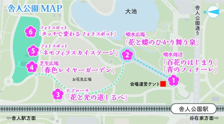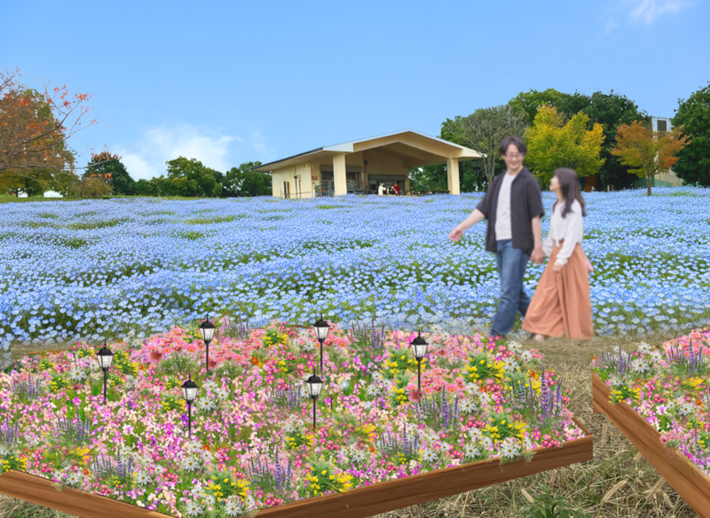 4回目の実施となる2026年は、舎人公園の代名詞の1つ、ネモフィラの「青」にスポットを当て、多彩な春の花々から青へと移ろう「色のストーリー」を、花とイルミネーション、音の融合で表現。春を彩る色とりどりの花々を進んで行った先には、「ネモフィラブルー」の絶景が広がる。
