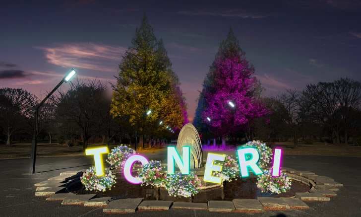 公園の入口となる噴水エリアでは、本イベントを象徴する花、ネモフィラとマーガレットやラナンキュラスなど、多彩な春の花々を組み合わせた花壇「百花の花景色」が出迎える。春の花の華やかさに、エッジの効いたネオンライトとミラー素材を融合させた「TONERI」のレターサインは、思わず写真を撮りたくなるフォトジェニックなスポットとなっている。また、メタセコイアの並木は、会期前半(4月10日~19日)の夜には「百花のはじまり」として色鮮やかな3色の光に、そして会期後半(4月20日~4月26日)の夜には「青のフィナーレ」としてブルーの光に包まれる。