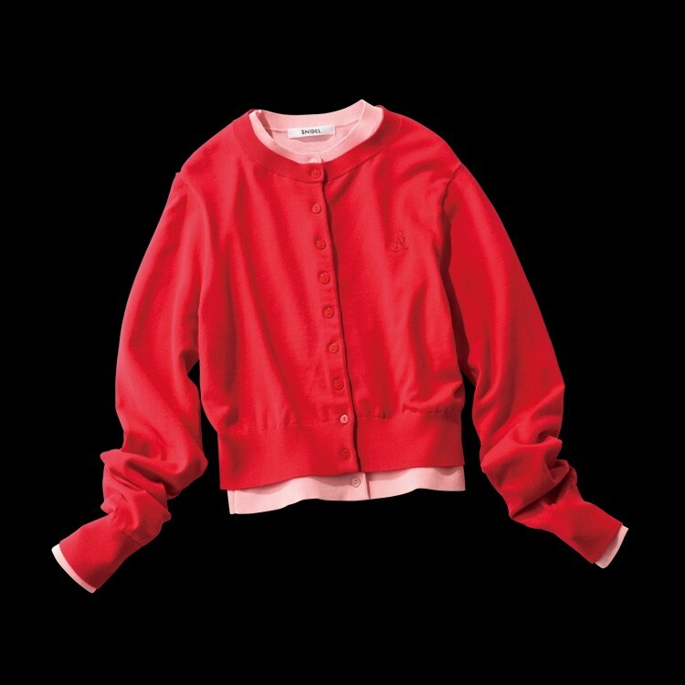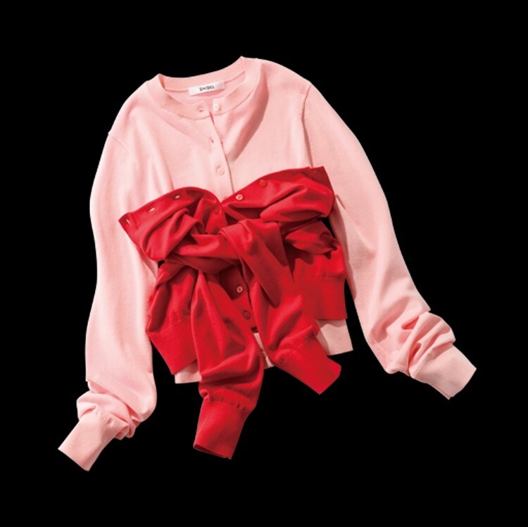 プレス・山浦まりなさん「この春はカーデ×カーデのように同じアイテムでのレイヤードが新鮮!2枚のカーデのセットなので、ビスチエのように巻くアレンジ方法もオススメしています」