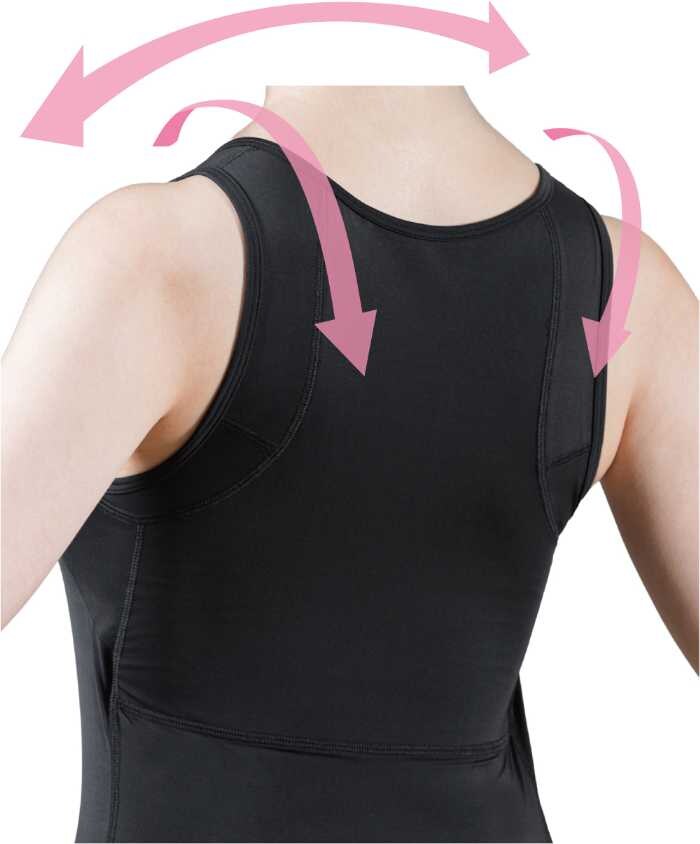 さらに、後ろ身頃上部に配置された大型パワーネットによるバックリリース機能が、肩甲骨を内側に引き寄せながら肩の位置を整えます。