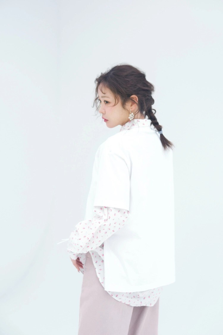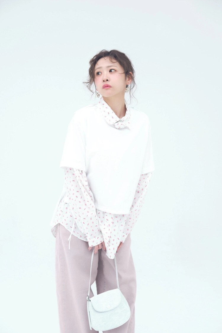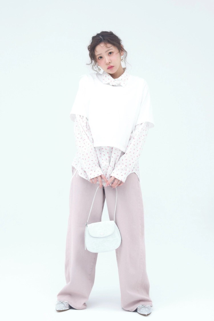 小花柄シャツ 17,600円/The Girls Society 白Tシャツ 29,700円/CHERIE(805showroom)ピンクデニムパンツ 16,500円/JILL byJILL STUART ルミネエスト新宿店 ミニバッグ 9,240円/mucu and ebony(HANA KOREA)イヤリング 3,960円/マチルダローズ フラットシューズ 17,050円/ダイアナ(ダイアナ 銀座本店)