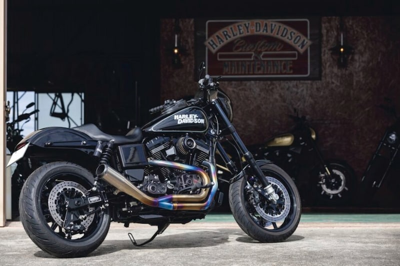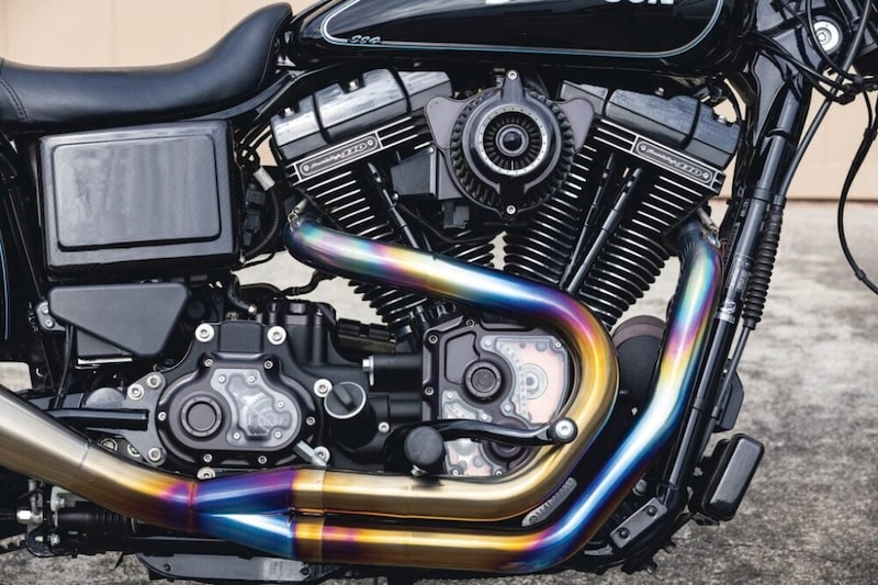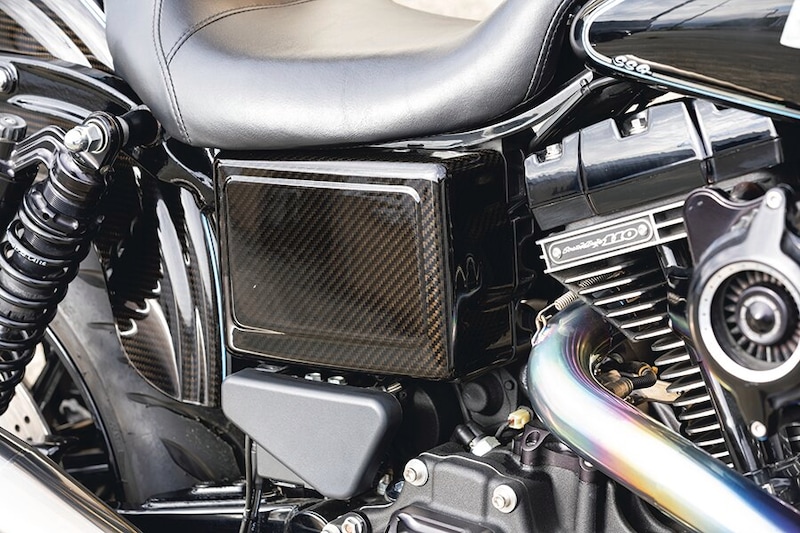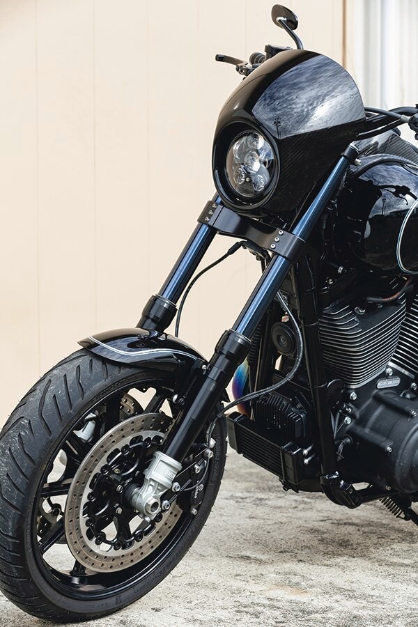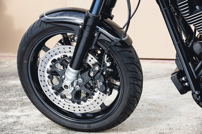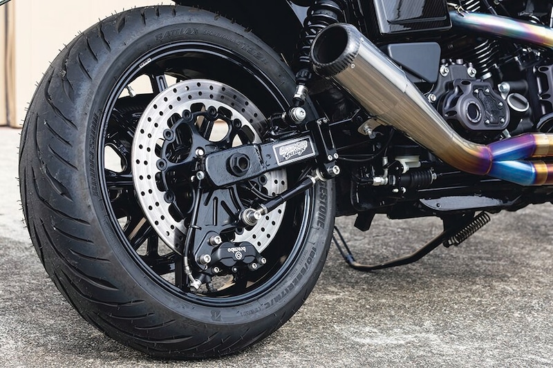 代表の須川さんによれば、スポーツスターに前後17インチの足まわりをセットアップすると、エンジンパワーがもの足りなく感じてしまう人も多いため、ダイナがベストな選択だという。