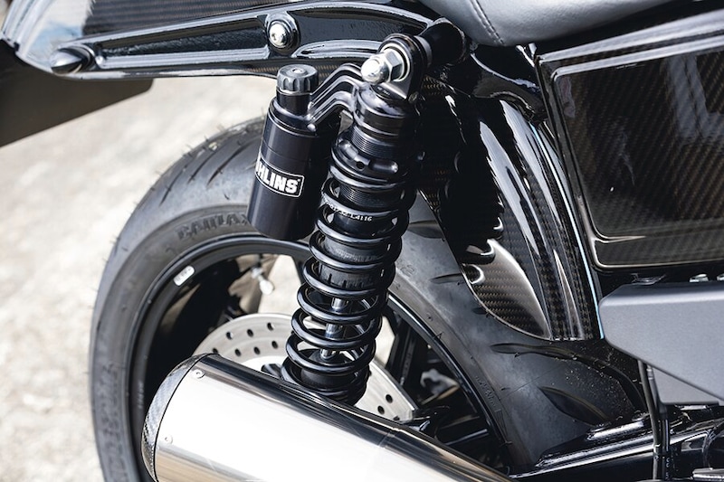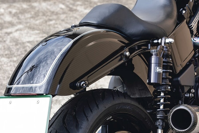 グライド製ホイールで前後17インチ化。リアは180/55-17のタイヤが履ける5.5インチ幅のカスタムサイズを選択。前後17インチ化はコーナリング中の接地感が抜群で、安心感の高い操縦性になるという特性がある。