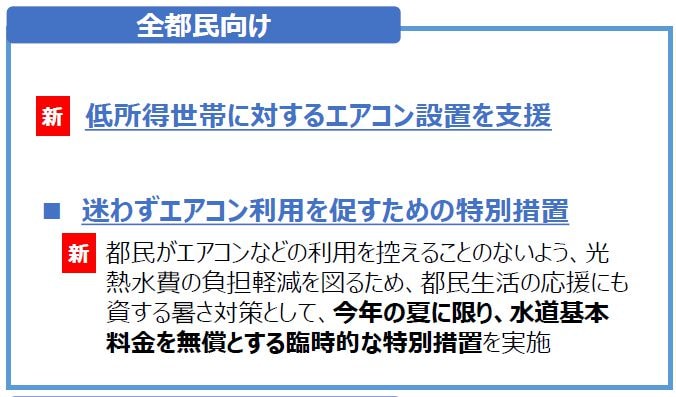 低所得者層へは、上述したエアコン設置支援や水道基本料金の無料化を新たに実施。
